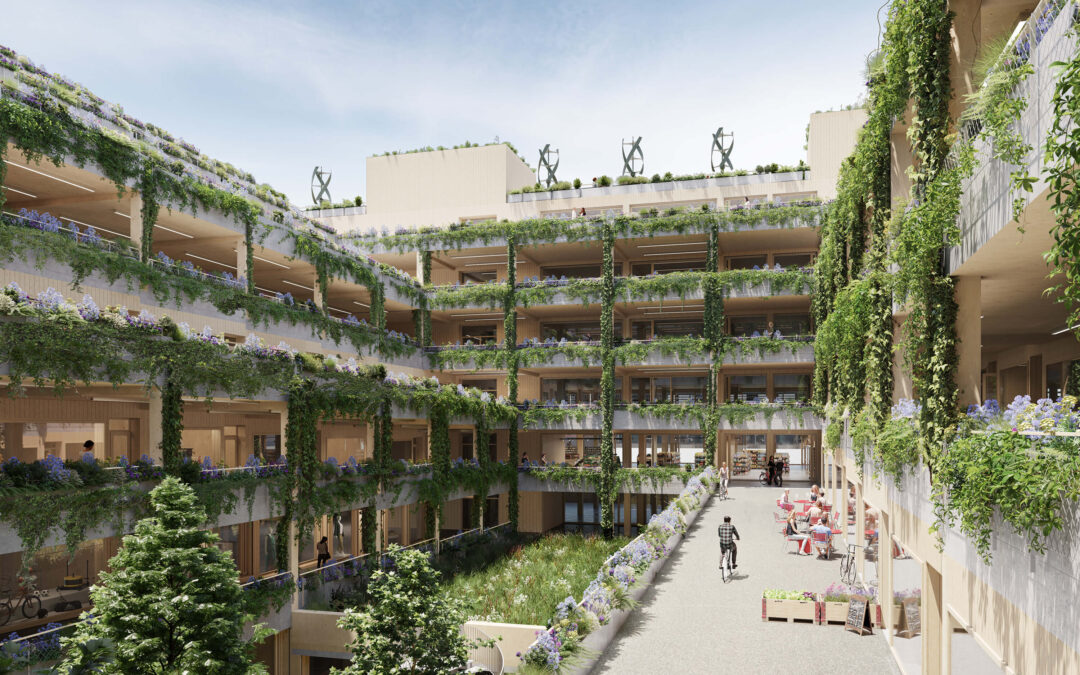 Der modulare Holzbau bietet eine langlebige, flexible Struktur und bindet CO₂. Die Systemtrennung optimiert den Lebenszyklus. Photovoltaik erzeugt einen grossen Teil des Stroms, Grünflächen fördern Biodiversität und Mikroklima. Windkraft bewässert die Bepflanzung, Begegnungszonen stärken die soziale Interaktion. Es wird angestrebt, dass das Gebäude nach dem internationalen Nachhaltigkeitsstandard BREEAM zertifiziert wird.