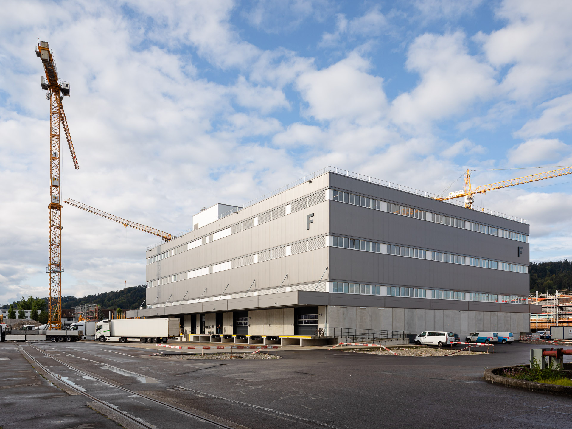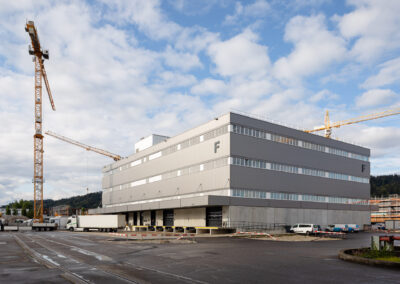 Der Neubau wird ergänzt durch einen fünfgeschossigen Bürotrakt sowie einen Zwischentrakt für Büro- und Verwaltungsnutzung. Für den effizienten Warenumschlag stehen Aussenrampen, neun Warenlifte sowie ein Personenlift zur Verfügung.