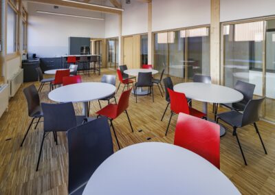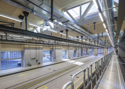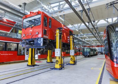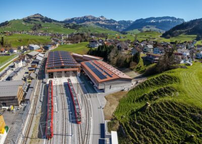 Das Bauprojekt Servicezentrum umfasst drei Einzelbauten: das Verkehrsgebäude, das Infrastrukturgebäude und das Nebengebäude. Die stützenfreie Verkehrshalle wurde mit Holzfachwerkträgern überspannt und bietet Platz für die Wartung von vier Zugkompositionen. Im Infrastrukturgebäude sind Büroräume, ein Hochregallager sowie eine unterirdische Einstellhalle untergebracht. Im Nebengebäude befinden sich Werkstätten, Büros, Aufenthaltsräume und Parkplätze. Umweltverträglichkeit und Nachhaltigkeit spielen bei diesem Projekt eine zentrale Rolle.