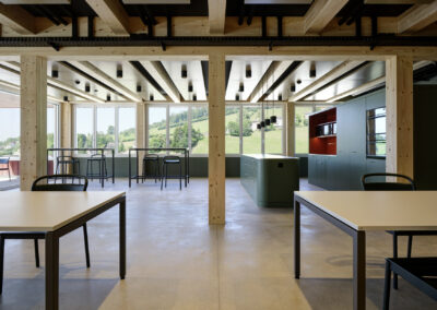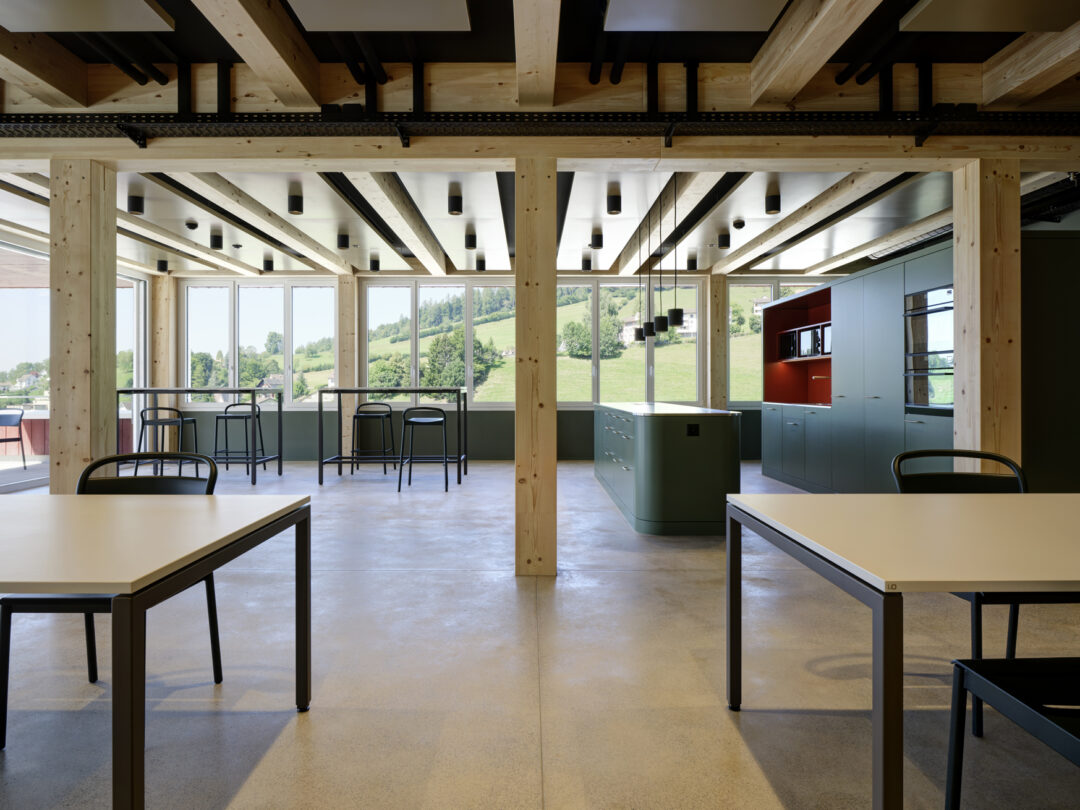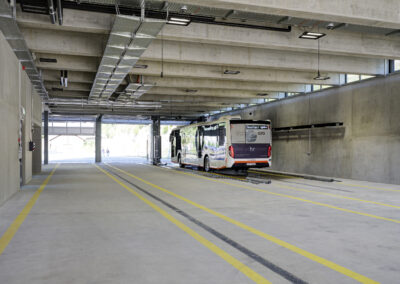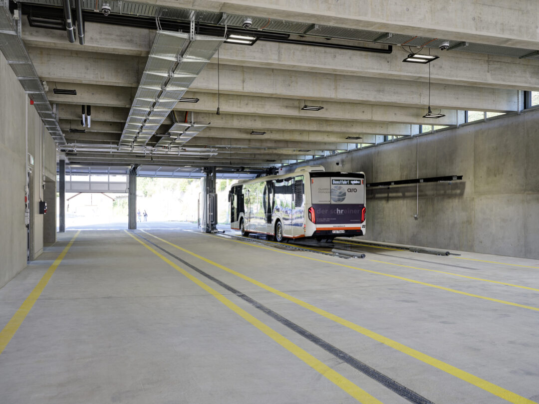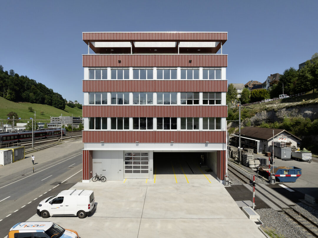 Am Standort des bisherigen Busdepots in Herisau entstand ein Neubau mit Buseinstellhalle für die Regiobus AG im Erdgeschoss und dem Verwaltungsbau der Appenzellerbahnen in den Obergeschossen. Die engen latzverhältnisse zwischen Bahngeleisen und Kantonsstrasse machten die Baustellenlogistik anspruchsvoll. Vorgespannte Stahlbetonträger überspannen die Einstellhalle und bilden die Abfangkonstruktion für den darüberliegenden viergeschossigen Holzbau. Dieser ist in Skelettbauweise mit regelmässigem Stützen- und Unterzugraster ausgeführt. Die Geschossdecken bestehen aus Holz-Beton-Verbunddecken mit Holzrippen und vorfabrizierten Betonelementen.