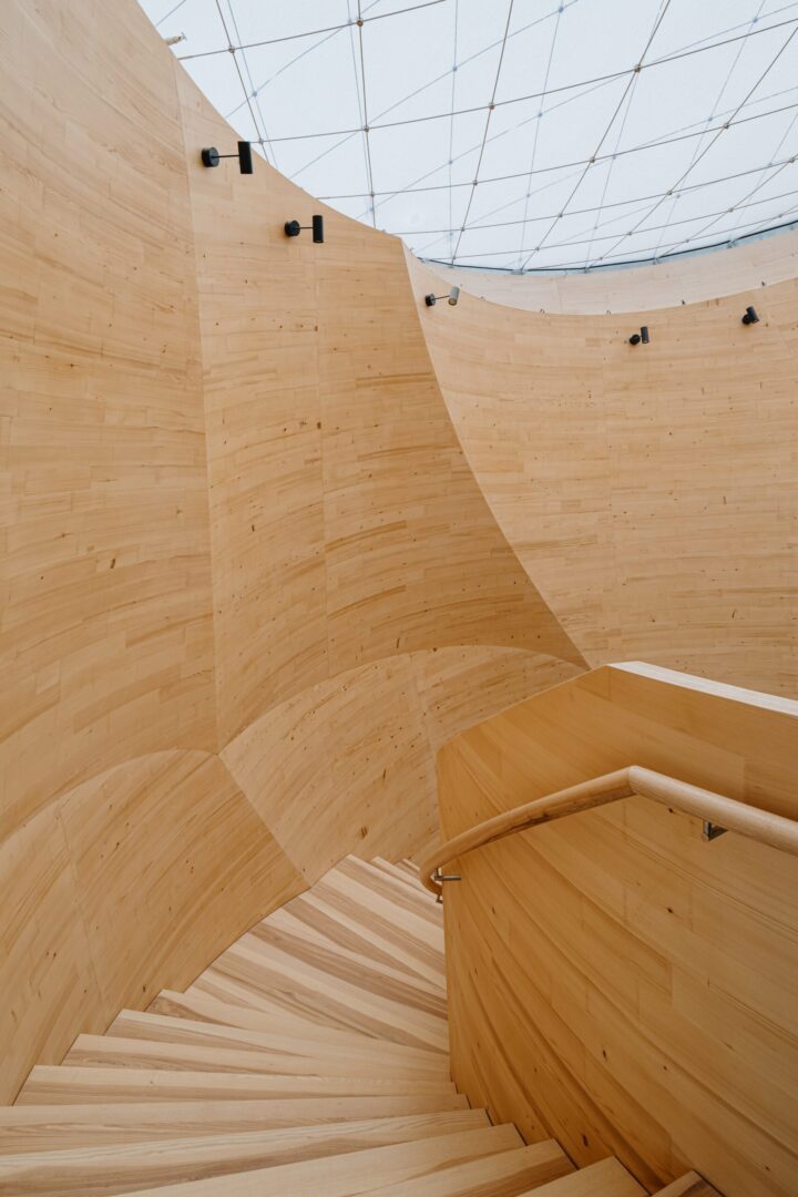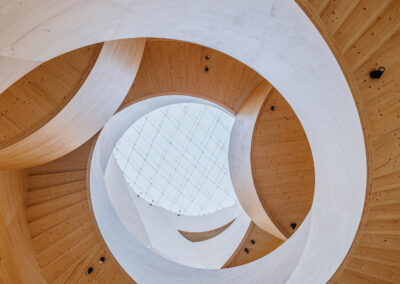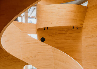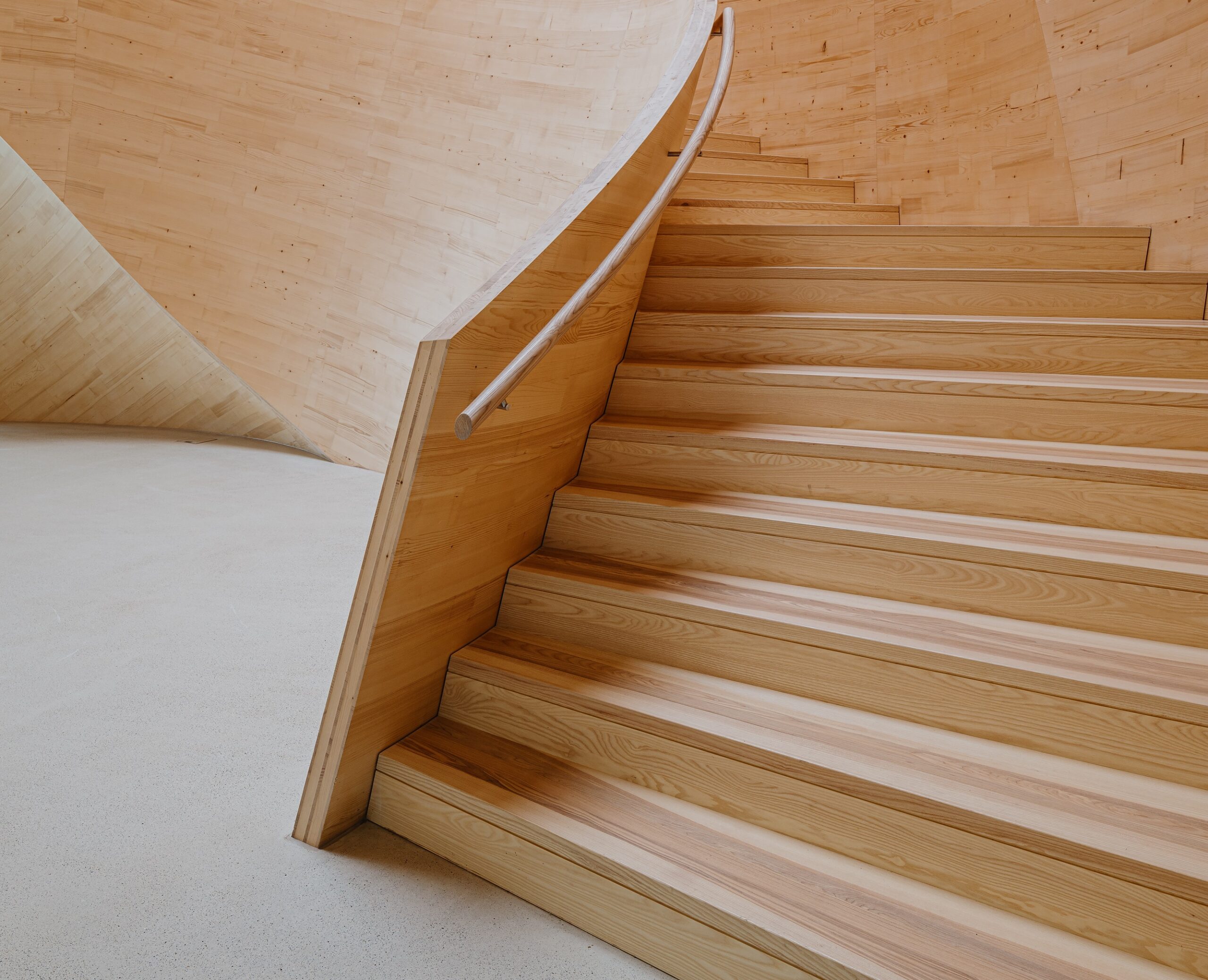 Das „Stammhaus“ ist das neue Bürogebäude der Blumer-Lehmann AG in Gossau. Zentrales Element des Gebäudes bildet das Atrium, das als vertikale Erschliessung dient und sich wie ein Stamm durch alle Geschosse zieht. Diese konstruktive und gestalterische Lösung war namensgebend für das Gebäude. Die gekrümmten Wandelemente der Free Form-Treppe haben auch eine tragenden Funktion für die umliegenden Geschossdecken und bestehen aus