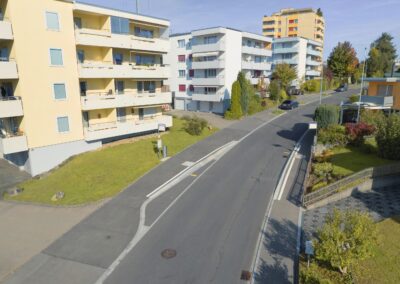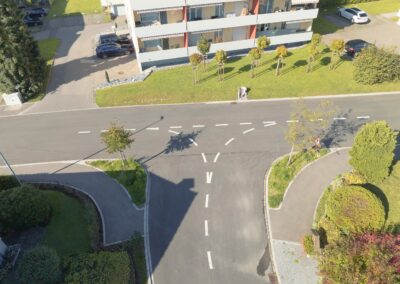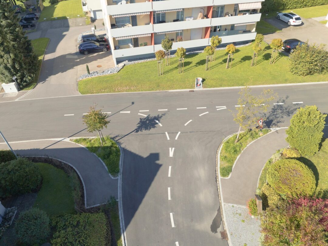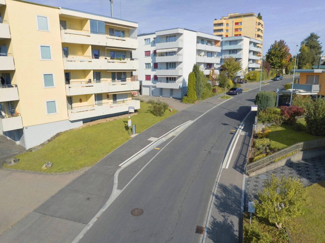 An der Lören- und Enzenbühlstrasse in Flawil wurden die Randsteine ersetzt und die Gehwege verbreitert, um mehr Platz und Sicherheit für Fussgänger zu schaffen. Die Bushaltestellen sind nun hindernisfrei zugänglich und neue Baumgruben tragen zu einer angenehmen Umgebungsgestaltung bei. Zudem wurde der Kreuzungsbereich optimiert, sodass der Verkehr für alle Verkehrsteilnehmenden übersichtlicher und sicherer geführt wird.
